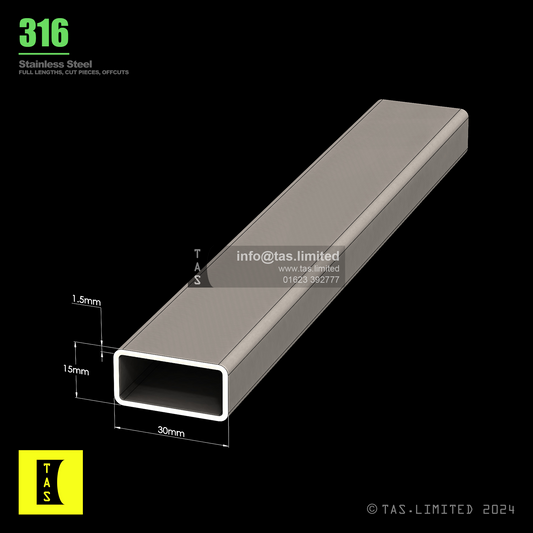 30 X 15 X 1.5 RECTANGULAR BOX SECTION, RHS, 316 STAINLESS STEEL, DULL POLISHED (1.4401 / 1.4404)